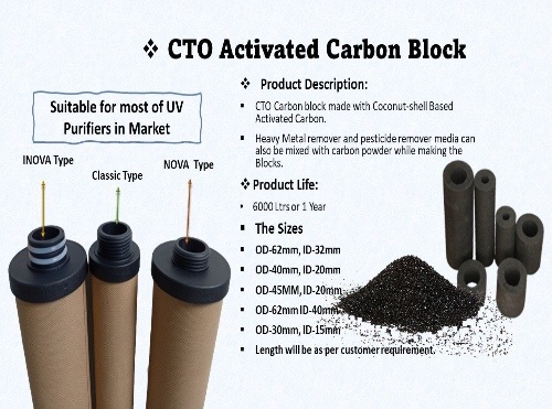 Compressed activated carbon filters for home and commercial drinking water systems, removing chlorine, taste, and odor.